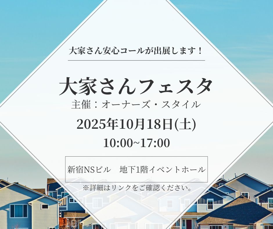 2025年10月18日(土)に新宿NSビルで開催される「大家さんフェスタ」(主催:オーナーズ・スタイル)に、「大家さん安心コール」を出展いたします。